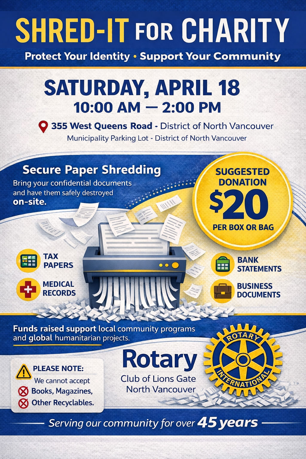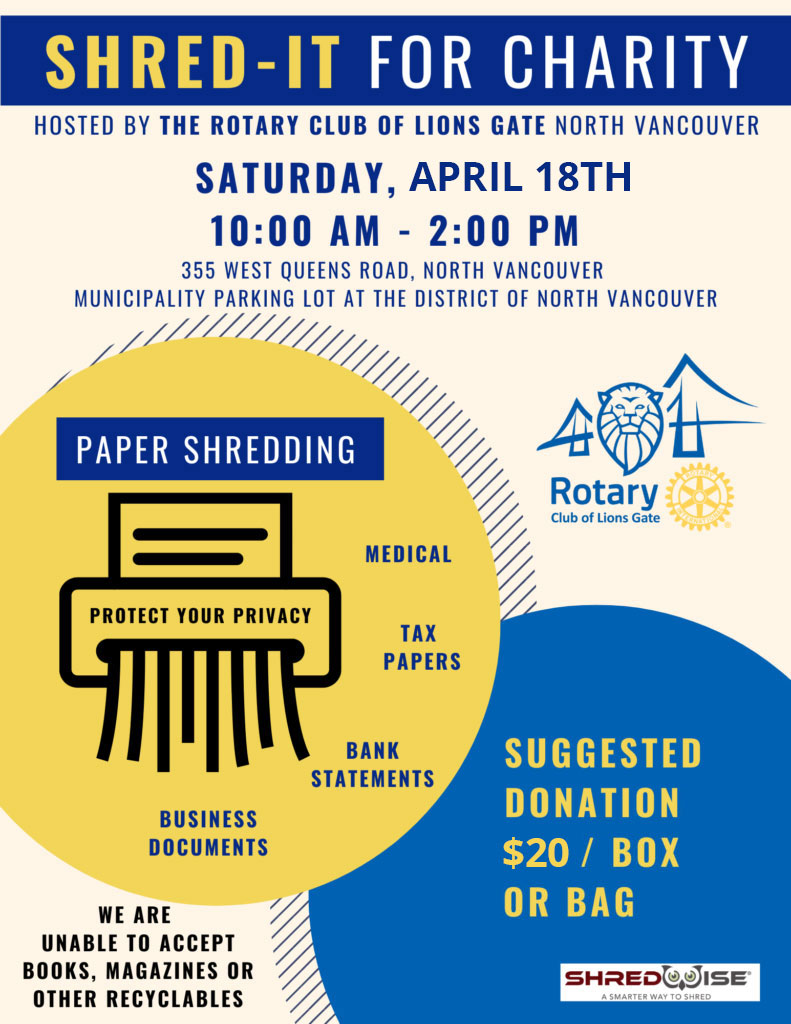 Looking to securely dispose of personal or professional paper or documents and give back to the local community at the same time? On Saturday, April 18th, Rotary Club Lionsgate invites you to participate in our 6th Shred-A-Thon, which Is co-sponsored by Shredwise-Shredding & Recycling and benefits local youth projects.